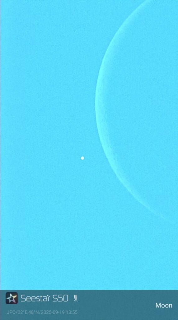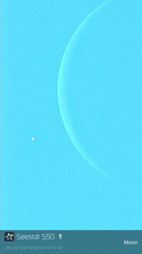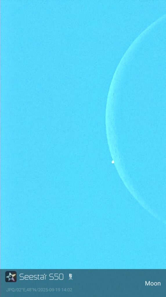 Ce phénomène n’a pas été simple à observer car il avait lieu en début d’après-midi, avec une élongation par rapport au Soleil de 27° seulement. Jean-Paul Quéau a réussi à pointer son Seestar S50 et à suivre la phase d’immersion : bravo !