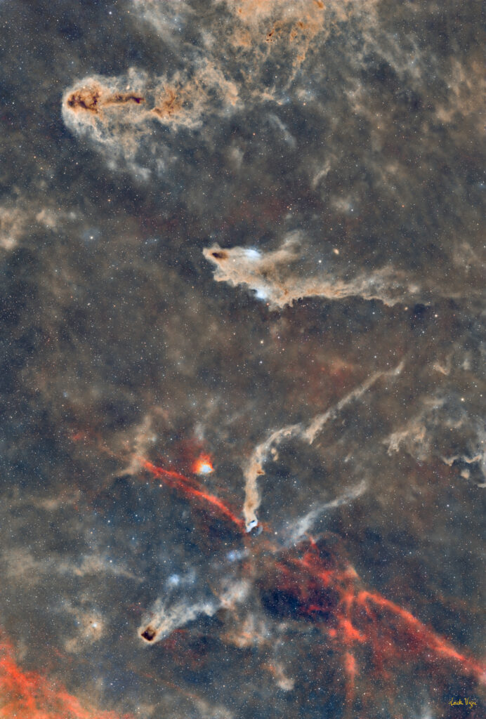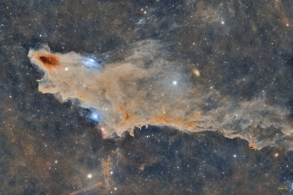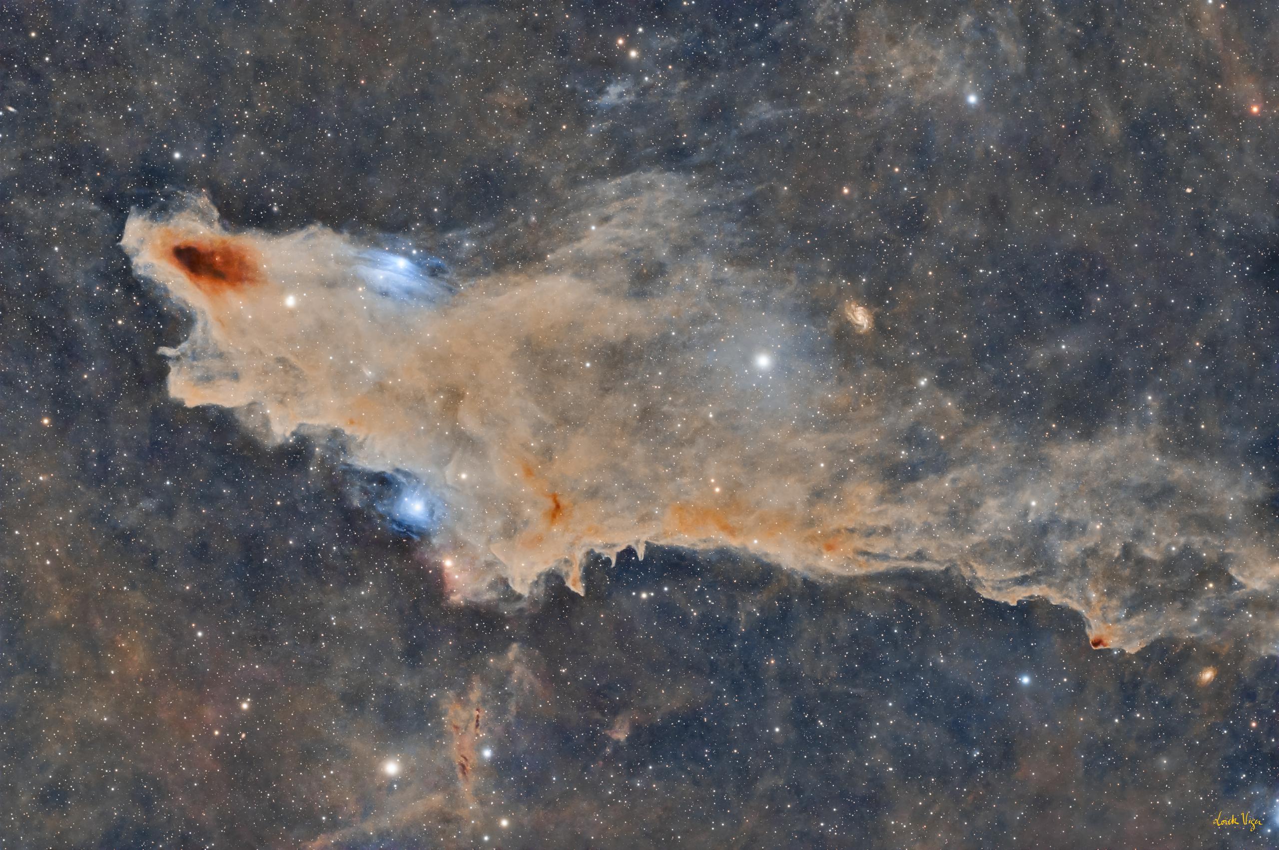 Photo Loïck VigerMême image, avec les annotationsLa nébuleuse du Requin, photo Loïck Viger, détails sur https://www.astrobin.com/y1te7l/