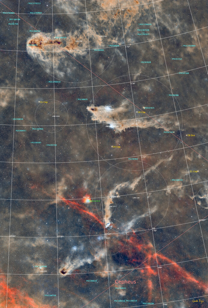 Céphée offre de magnifiques, mais subtils, complexes à observer. Cette superbe prise de vue en grand champ avec un objectif Samyang 135mm a été réalisée par Loïck sous un ciel très noir dans le Morvan. Elle couvre un champ de 7,4° x 5° et a nécessité plus de 22h de pose… On retrouve au centre la nébuleuse du Requin, plus haut celle du Poisson Pourri, plus bas celle par réflexion du Grand Tétras. Cette image révèle également un rémanent de supernova sous la forme d’un long filament rouge, et bien d’autres nébuleuses sombres, en émission, et également une nébuleuse planétaire. Tous les détails sur la page Astrobin de Loïck : https://www.astrobin.com/bfcgr6/
