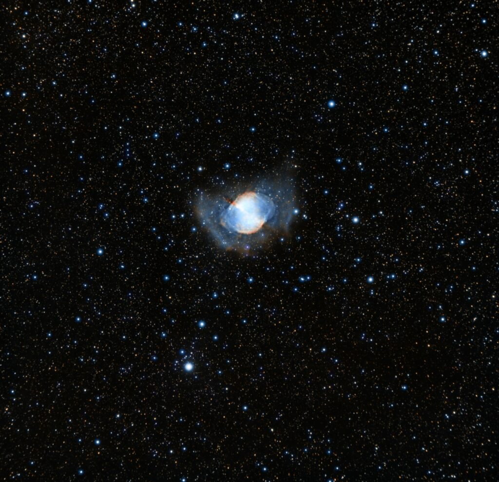 Un grand classique du ciel profond, dans la constellation du Petit Renard. Cette nébuleuse planétaire, située à 1250 années-lumière de nous, est une star de l’observation et de la photo en raison de ses très belles couleurs et de sa luminosité relativement élevée (magnitude visuelle 7,4). Par contre, il n’est pas si facile de faire ressortir les extensions, et c’est ce qu’a réussi à faire Laurent dans cette prise de vue effectuée en 5h de pose avec une lunette Skywatcher 82ED équipée d’une caméra ASI 533MC.