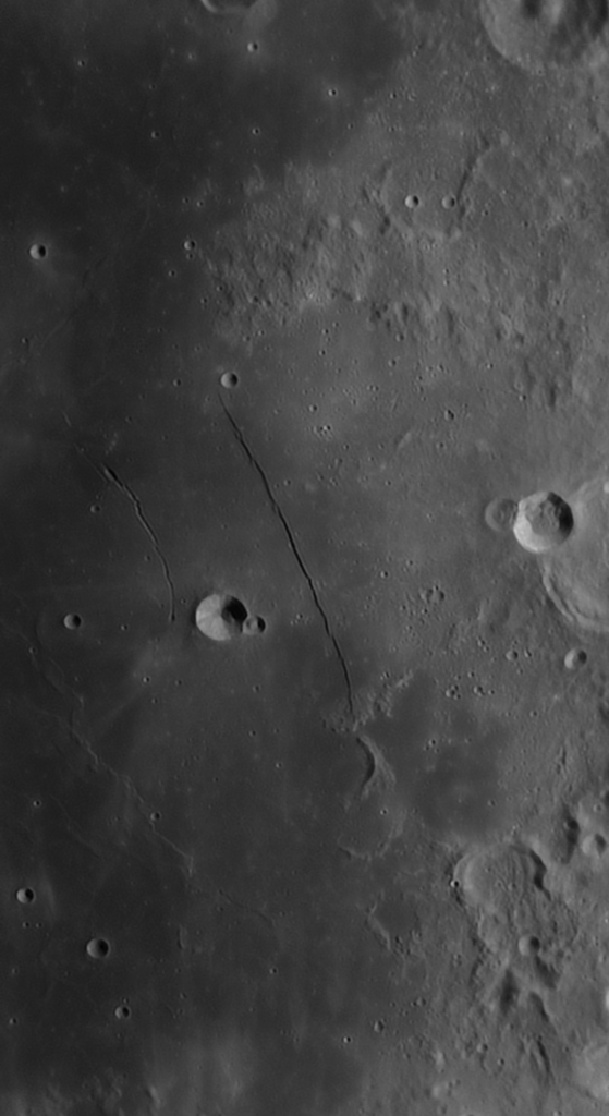 Et voici ensuite, Rupes Recta, le Mur Droit, situé dans la mer des Nuées : c’est une crête de 120 km de long et 2 à 3 km de large, pour une hauteur de 300 m environ, qui passe entre les cratères Birt et Thebit. Il faut le saisir au bon moment, avant que son ombre disparaisse. Il a été découvert en 1686 par Christian Huyghens qui l’avait appelé « Epée dans la Lune ».