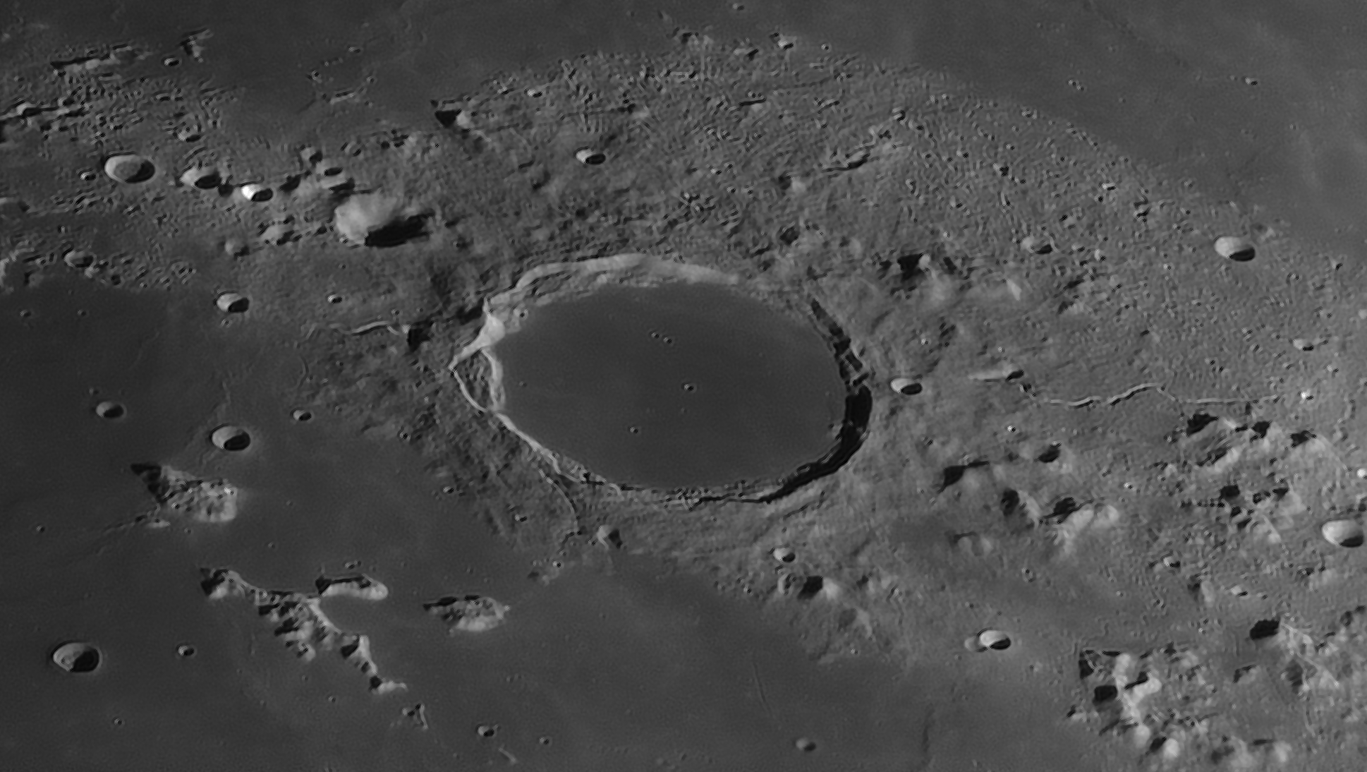 Voici d’abord le fameux cratère Platon, de 100 km de diamètre avec ses pans de falaise de 2000 m effondrées à l’ouest. Son nom lui a été donné en 1651 par Giovanni Battista Riccioli, jésuite italien (il était surnommé peu avant « Grand Lac Noir » par l’astronome Johannes Hevelius).