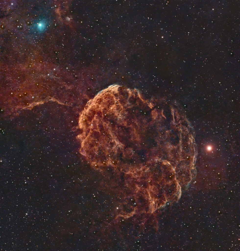 Un des intérêts de cette image réside dans le fait qu’elle a été réalisée en cumulant les poses effectuées en mars par 4 membres (Pascal, Emmanuel, Laurent, Jean-Paul) avec des Seestar S30 Pro en filtre dual band, pour un total de 19 heures. Un beau traitement réalisé par Jean-Paul sous Pixinsight nous donne cette très belle image qui démontre ce que l’on peut obtenir avec les télescopes automatisés d’aujourd’hui.