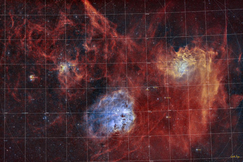 L’image permet aussi d’embrasser dans son champ les nébuleuses de l’Araignée (IC417) et de la Mouche (NGC1931), situées toutes deux à 7500 a.l. de nous.
