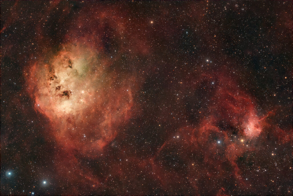 En ce moment des fêtes de Noël, petit voyage dans la constellation du Cocher (celui qui pilote les rennes ?) pour admirer ces trois objets. IC410 est une nébuleuse en émission située à 11000 a.l., et qui héberge l’amas ouvert NGC1893 âgé d’environ 10 millions d’années. On l’appelle aussi nébuleuse des Têtards. IC417, aussi appelée nébuleuse de l’Araignée, située à 7500 a.l. est le siège de puissants processus de formation d’étoiles. Elle héberge l’amas ouvert Stock 8, dont les étoiles sont jeunes avec des âges s’étalant de 1 à 5 millions d’années, ce qui fait penser que la formation d’étoiles a eu lieu à plusieurs reprises dans cette région. Ces objets ont été imagés par Loïck dans des conditions et avec un traitement différents : voir le post du 1er décembre. Une image prises par Jean-Philippe dans des conditions difficiles avec l’arrivée d’un nouvel éclairage urbain à LED qui éclaire directement son jardin !… Le résultat est néanmoins superbe. Cette photo a été prise avec une lunette Esprit 100ED accompagnée d’un aplanisseur de champ, d’un filtre Antlia 3B et d’une caméra ASI2600MC Pro, pour un total de 2h30 de pose (30 x 5′). L’image en pleine définition est disponible ici.