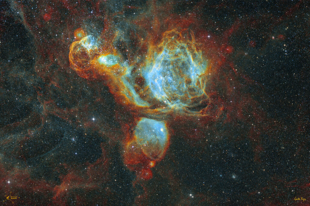 Pour terminer l’année en beauté, voici une image de NGC1955 prise depuis le Chili. C’est un amas ouvert associé à une nébuleuse en émission situés à 158000 a.l. dans la constellation australe de la Dorade, au sein du Grand Nuage de Magellan. On aperçoit également NGC1974 et NGC1968 en haut à gauche de la photo. Tous les détails (et il y en a !) sur ces formations nébulaires sont ici. L’image a été réalisée avec un Newton 355/1780 équipé d’une caméra Player One Poseidon M-Pro accompagnée de filtres SHO et LRGB, pour un temps total de pose de 9h15.
