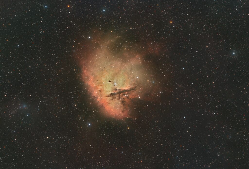 Cette région HII se situe à environ 10000 années-lumière de nous dans la constellation de Cassiopée. Elle a à peu près la dimension apparente de la Lune, avec une dimension réelle de 100 a.l. Photo réalisée en 2h30 de pose avec une lunette Esprit 100 / 555 équipée d’une caméra ASI2600 MC Pro et d’un filtre Antlia 3B.