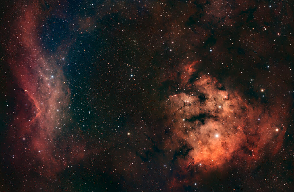 L’image a été réalisée avec un Newton 355/1780 équipé d’une caméra Player One Poseidon M-Pro accompagnée de filtres SHO et LRGB, pour un temps total de pose de 9h15.