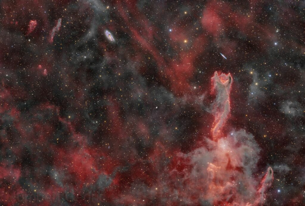 Visuellement, CG4 se distingue par sa forme allongée : une « tête » compacte et opaque, suivie d’une queue diffuse qui s’étire sur plusieurs années-lumière. Cette morphologie est due au rayonnement intense et aux vents stellaires émis par des étoiles massives voisines, qui érodent progressivement le nuage et sculptent sa silhouette caractéristique.